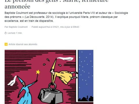 Baptiste Coulmont est professeur de sociologie à l’université Paris-VIII et auteur de « Sociologie des prénoms » (La Découverte, 2014). Il explique pourquoi Marie, prénom classique par...