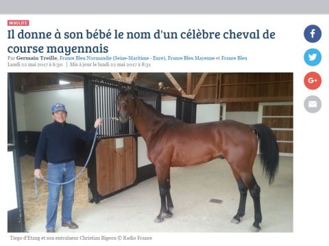 Un turfiste normand a prénommé son fils Tiégo. Un hommage à Tiégo d'Etang que son entraîneur mayennais, Christian Bigeon, vient de mettre à la retraite. Un grand amateur de courses, Damien Houas,...